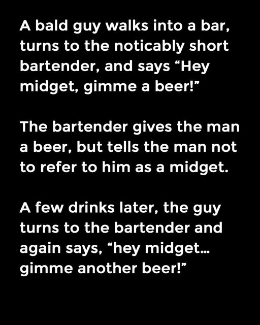 The bartender gives the man a beer, but tells the man not to refer to him as a midget. A few drinks later, the guy turns to the bartender and again says, “hey midget… gimme another beer!”