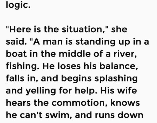 A fourth-grade teacher was giving her pupils a lesson in logic. “Here is the situation,” she said. “A man is standing up in a boat in the middle of a river, fishing.