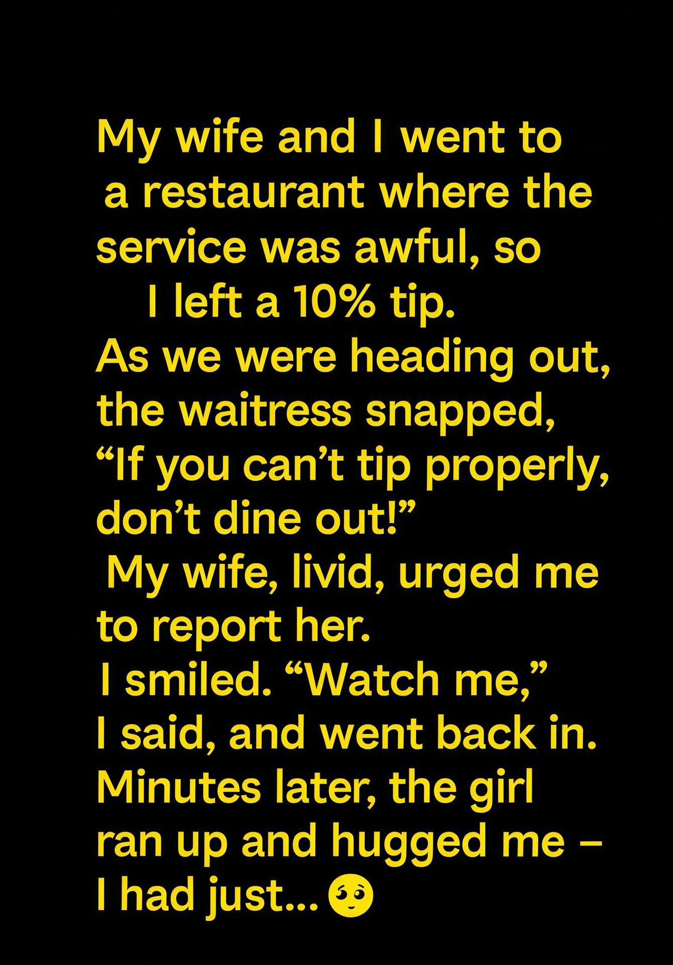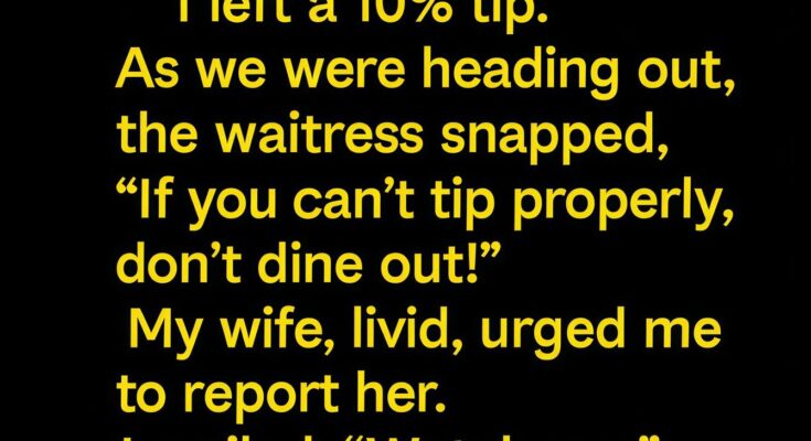 When the check came, I left a modest ten-percent tip and we headed for the door. That’s when the waitress snapped, “If you can’t tip properly, don’t dine out!” My wife stiffened instantly. “You should report her,” she whispered, clearly offended.