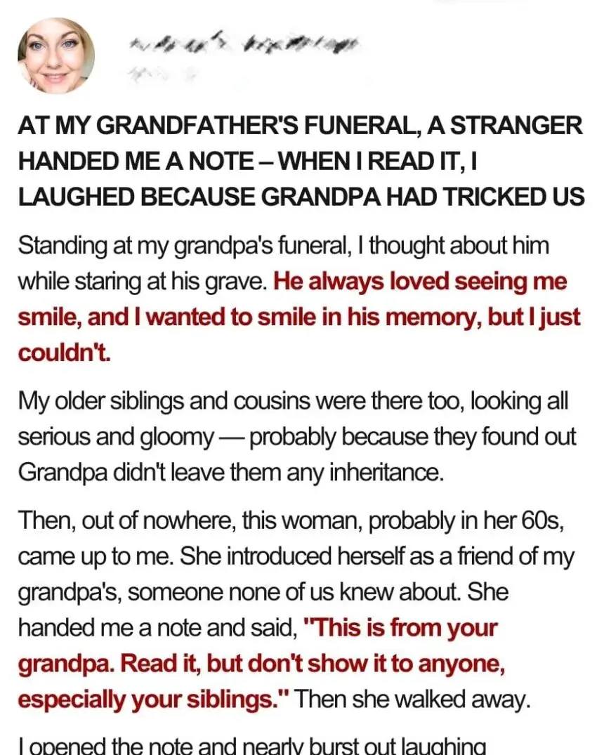 At My Grandfather’s Funeral, a Stranger Handed Me a Note – When I Read It, I Laughed Because Grandpa Had Tricked Us