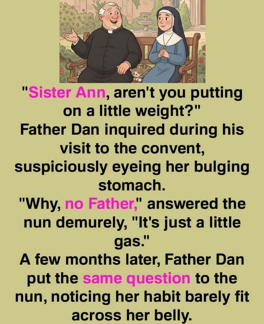 A few months later Father Dan put the same question to the nun noticing her habit barely fit across her belly. “Oh, just a bit of gas,” said sister Ann, blushing a bit.