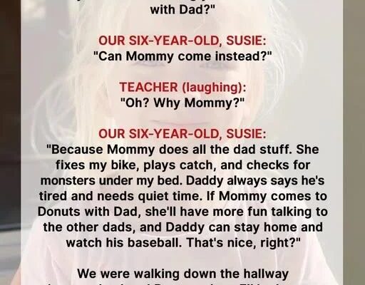 When Susie asked her teacher if Mommy could come to “Donuts with Dad,” it wasn’t meant to be a protest. Just a fact, spoken by a child who didn’t know her words would split something wide open. “She does all the dad stuff,” she said.
