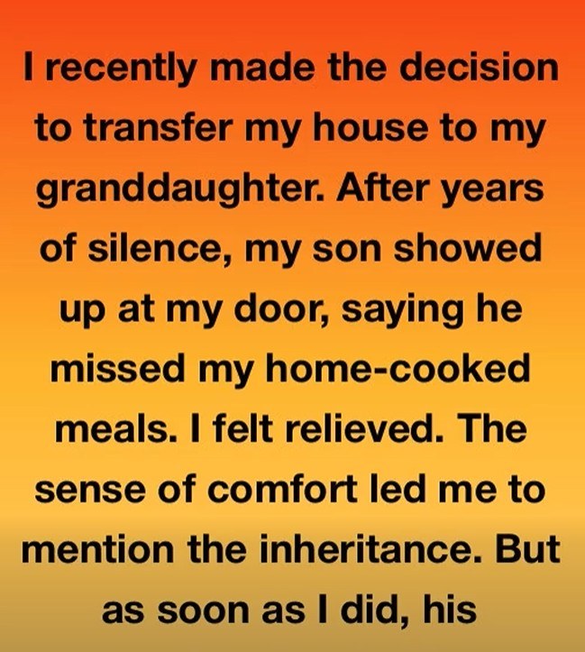 I recently made the decision to transfer my house to my granddaughter. After years of silence, my son showed up at my door, saying he missed my home-cooked meals. I felt relieved. The sense of comfort led me to mention the inheritance. But as soon as I did, his expression shocked me.
