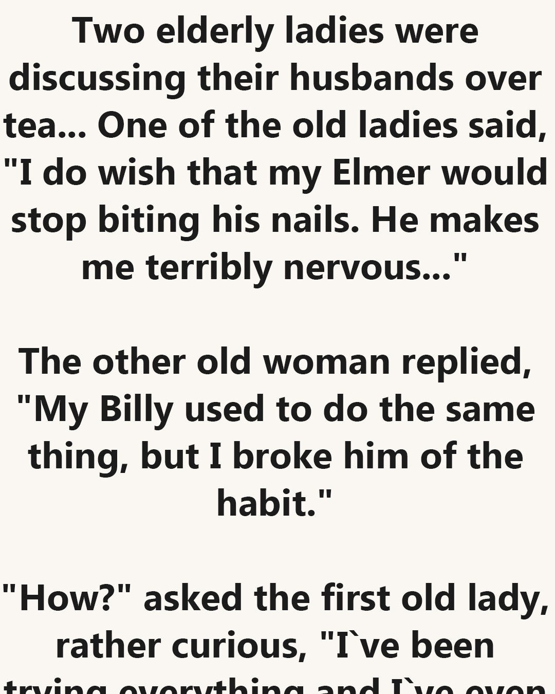 One of the old ladies said, “I do wish that my Elmer would stop biting his nails. He makes me terribly nervous…”