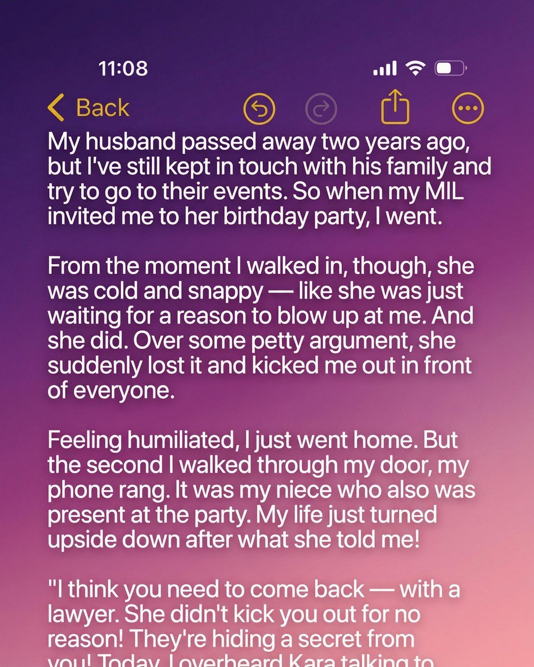 When I got home, the silence of my house felt heavier than usual. I barely had time to set my keys down before my  phone rang. It was my niece, her voice low and urgent. She told me she had witnessed more than I realized at the party—whispered conversations, nervous reactions, and a clear sense that my presence had made certain people uncomfortable. According to her, the argument wasn’t the real reason I was asked to leave. There was something being discussed behind closed doors, something connected to my late husband and decisions made after his passing.