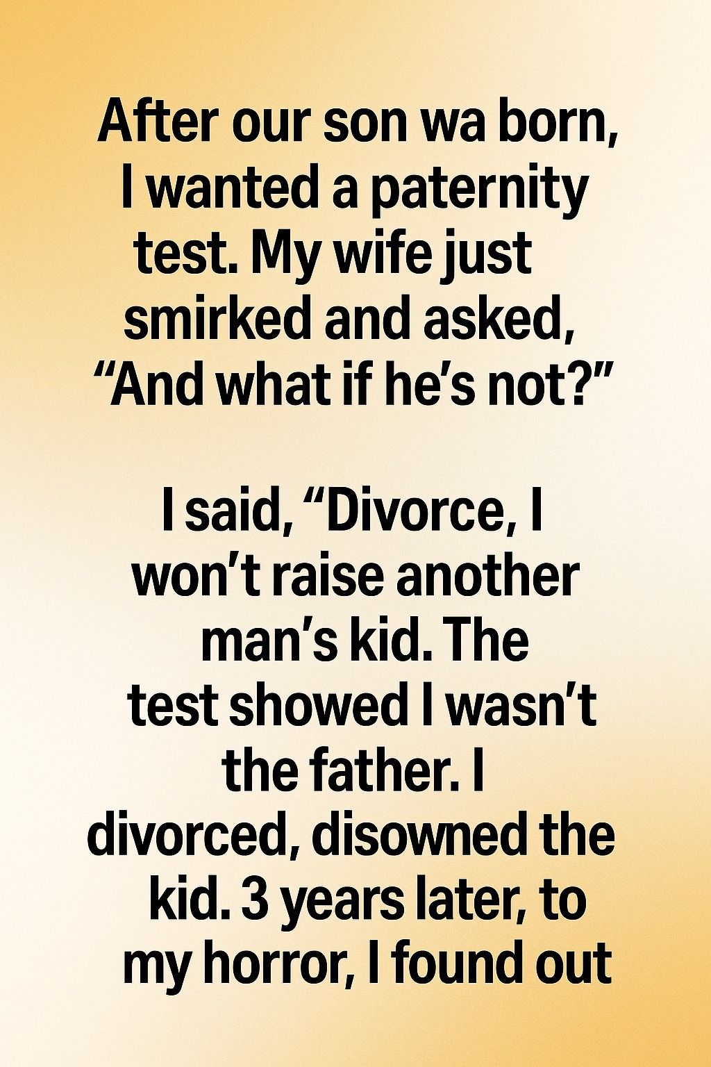 The test, he said, might have been wrong. Panicked and desperate, I ordered another DNA test, and when the results arrived, my heart nearly stopped. The boy was my son.